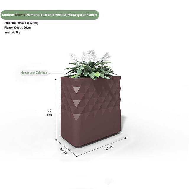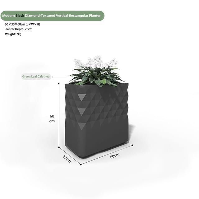 The Diamond Geo Vertical Rectangular Planter Collection is a premium landscaping solution designed for both residential and commercial spaces, blending functionality with modern aesthetics. Available in two core sizes—60×30×60cm (L×W×H) and 60×30×80cm (L×W×H)—each planter features a 26cm planting depth (ideal for root growth) and a lightweight design of only 7kg, making it easy to move and install. Crafted with a unique 3D diamond geometric texture, it comes in three versatile colors: modern white, modern brown, and modern black, ensuring seamless integration with minimalist, retro, or industrial decor styles. Whether used alone or spliced into continuous green belts, this planter is specially optimized for foliage plants like Green Leaf Calathea, balancing vertical space utilization with eye-catching visual appeal.