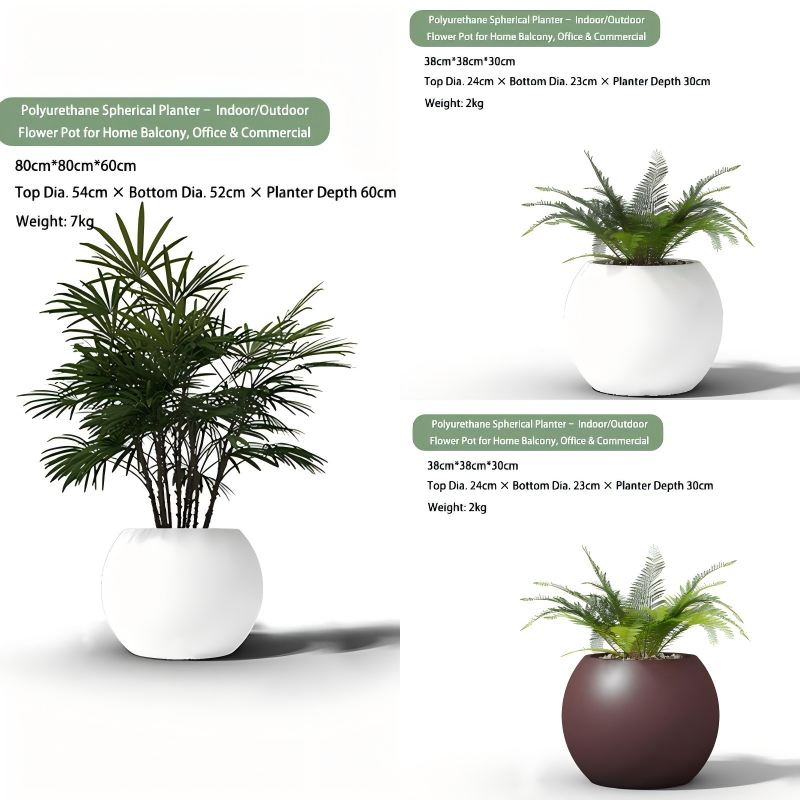 The Polyurethane Spherical Planter is crafted from premium polyurethane composite, a material chosen for its eco-friendliness, durability, and safety. This material is EU REACH-certified, meaning it contains no harmful substances, making it safe for homes with children and pets. Unlike metal or cement planters, it’s non-toxic and free of heavy metals, aligning with sustainable living values. The polyurethane material also offers superior resistance to cracking, fading, and rusting, ensuring the planter retains its shape and appearance for years.